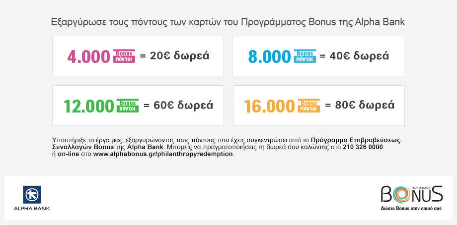 Μπορείς να πραγματοποιήσεις τη δωρεά σου εξαργυρώνοντας πόντους που έχεις συγκεντρώσει από το Πρόγραμμα Bonus της Alpha Bank με ένα τηλεφώνημα στο 210 326 0000 ή online στο